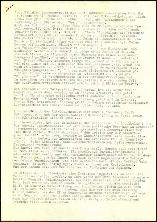 Die Vokskampagne gegen Kernkraft ist auf diesem Hintergrund ein wichtiger Faktor zur Vorbereitung, eine grüne Partei zu bilden. Die Debatte um die Atomkraft wurde überigens mit eimen völkischen Engagement geführt, das seit vielen Jahren in Schweden unbekannt war. Dieses völkische Erwachen bring tdie schwedische Politik mehr auf eine Linie mit der dänischen und norwegischen- jetzt kennt man auch in Schweden die Kraft der Graswurzeln, da es wirklich gilt. “Miljöbewegungen (Umwelt?) “ haben sich vielerorts in Schweden politisch formuliert- am strärksten in der Kommunalverwaltung hat. In derselben Hauptstadt hat eine Miljöliste, die zum grossen Teil aus sozialdemokratischen Abweichlern besteht, 3 Plätze im Beirat.